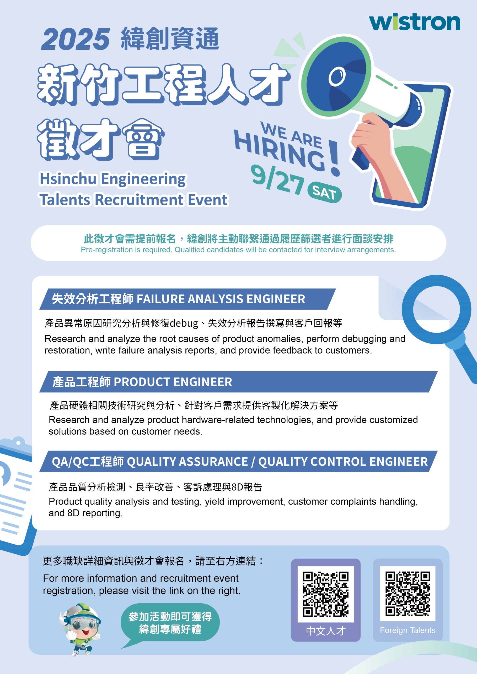 緯創資通現正積極公開招募工程領域相關人才,並將於2025/09/27(六)辦理「工程人才徵才會」專場徵才活動,詳參附件圖檔