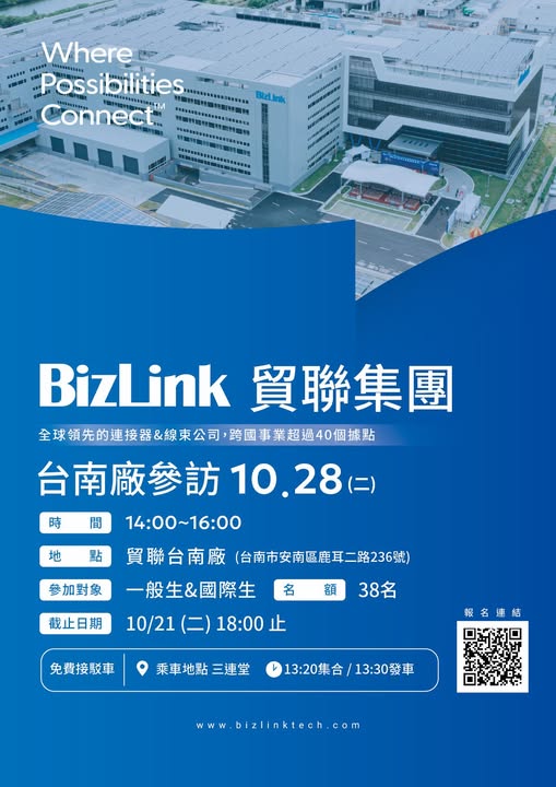 想近距離了解國際企業的工作環境與產業趨勢嗎⁉️本校特別安排 BizLink 貿聯集團臺南廠參訪活動,邀請你一起探索全球領先的連結器與線束公司,跨國事業據點超過 40 個,是深入認識國際職涯的難得機會~