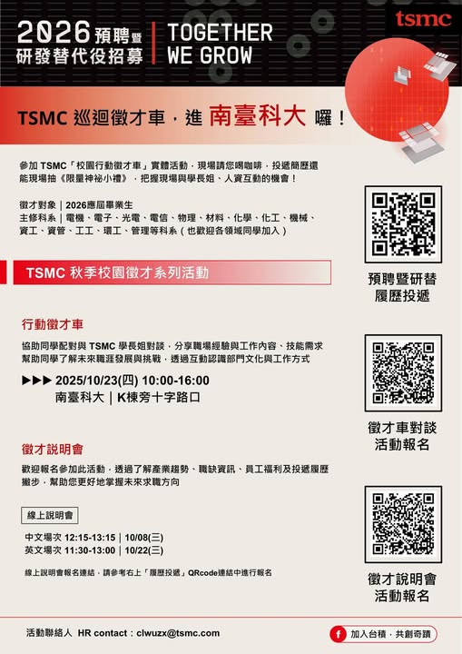 💥tsmc秋季校園徵才系列活動💥2026預聘暨研發替代役_人才招募
