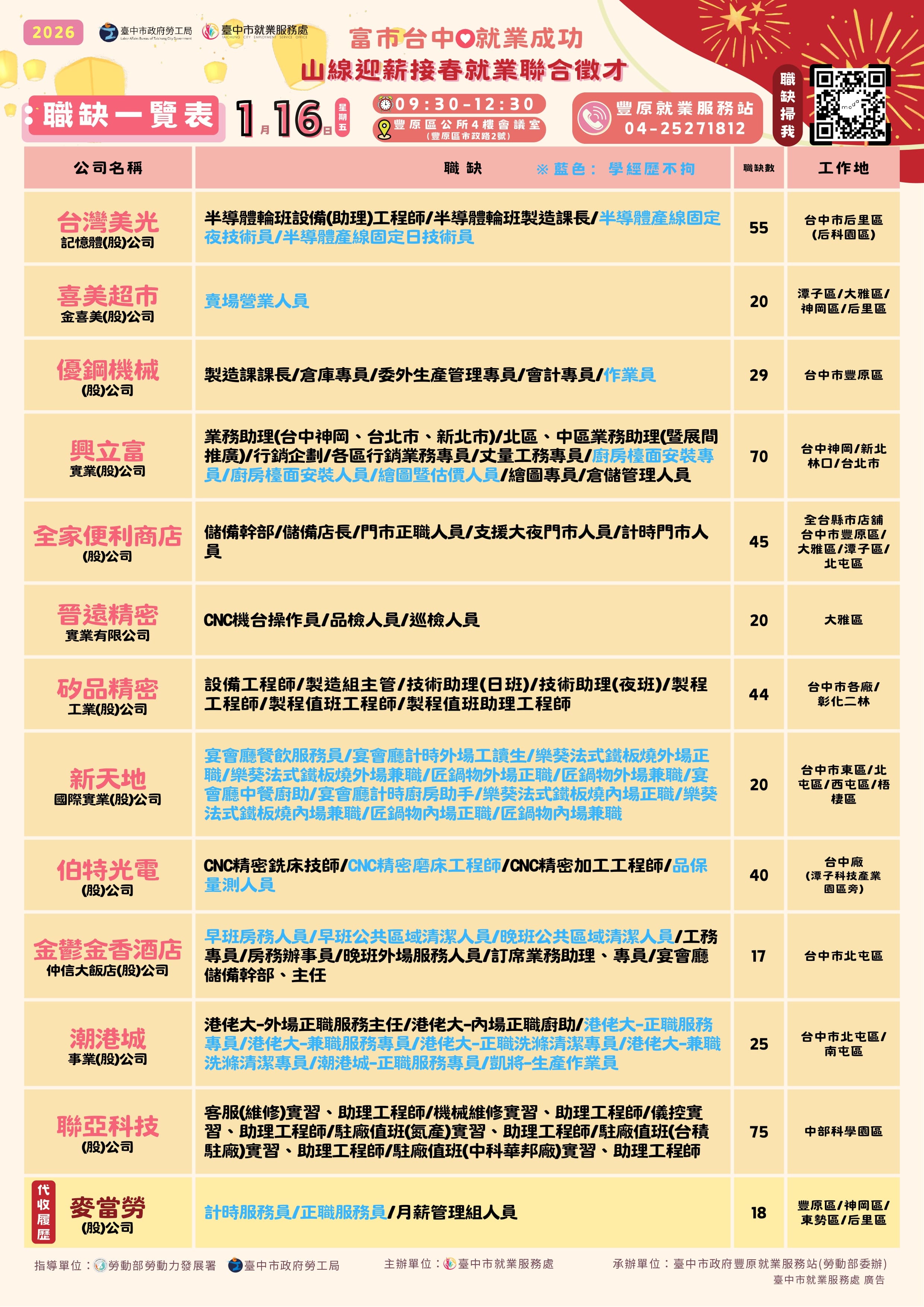 臺中市就業服務處將於 1 月 16 日(星期五)上午 9 時 30 分至 12 時 30 分,於 豐原區公所 4 樓會議室 辦理 聯合徵才活動。
