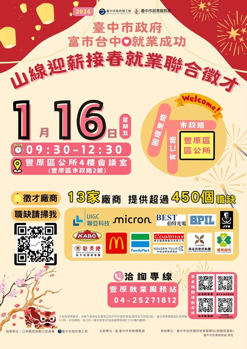 臺中市就業服務處辦理聯合徵才,邀請台灣美光、聯亞科技、全家便利商店及新天地等共13家,提供超過450個職缺~